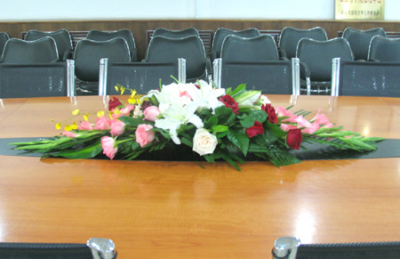 【名称】:白百合粉玫瑰扶郎桌花 【用途】:会议【主要花材】玫瑰、百合【规格】:80cm × 30cm 桌花参考【描述】: 此款会议桌花,是我们有着丰富插花经验的花艺师采用白百合、红掌、桔色扶郎、粉玫瑰搭配红色康乃馨,以春雨、散尾葵为衬托所精心设计制作的,营造高雅、和谐的会议环境。会议桌花——主要摆放于会议桌桌面,会议桌花的具体尺寸可以根据会议桌的大小进行调整。
